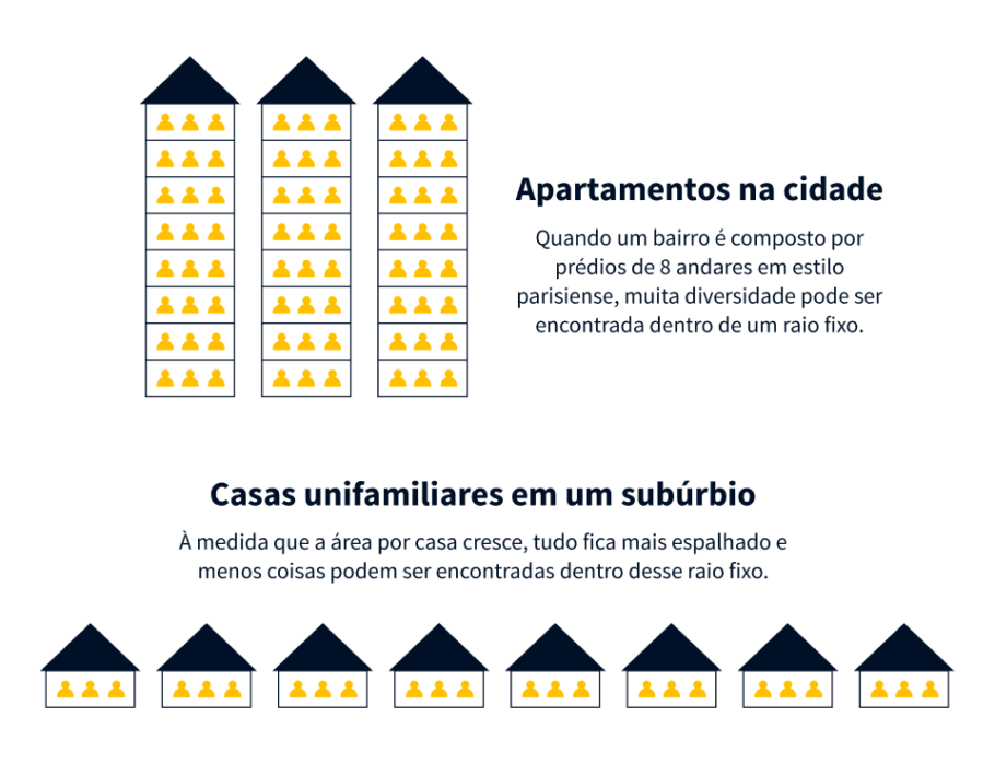 Imagine um bairro onde todos vivem em um prédio de apartamentos parisiense de 8 andares. Agora, vamos movê-los todos para um bairro com residências unifamiliares de um andar com o dobro da área. Por uma primeira aproximação extremamente conservadora, tudo de repente está 16 vezes mais espalhado. Seu amigo que morava a 15 minutos a pé agora mora a 35 minutos.