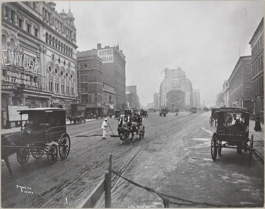 No final do século 19, a Times Square ainda era chamada de Longacre Square, uma área aberta sem grandes atrativos rodeada por apartamentos.