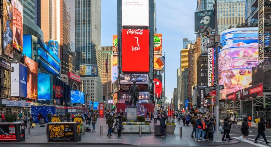 A Times Square se tornou espontaneamente em um polo de entretenimento de Nova York, repleta de teatros, casas de música e hotéis de luxo. Surgem e rapidamente se consolidam os primeiros painéis luminosos da cidade, desde então gerando altas receitas da publicidade de outdoors.