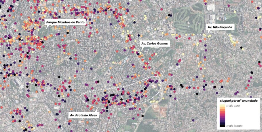 Os valores de aluguel servem como indicativo dessa diminuição da demanda por unidades comerciais vista na Protásio Alves. No mapa da imagem abaixo, cada ponto representa um anúncio de aluguel de uma loja ou sala comercial, com as cores mais escuras indicando os itens com menor valor de aluguel por área útil da unidade. Nota-se que um dos trechos que compõem a Avenida Protásio Alves combina uma grande quantidade de anúncios com valores abaixo do que se observa em seus arredores. Isso sinaliza que há uma oferta de espaços comerciais no local maior do que a demanda existente por eles, de modo que os proprietários acabam tendo que diminuir o valor do aluguel para conseguir atrair locatários para a área.