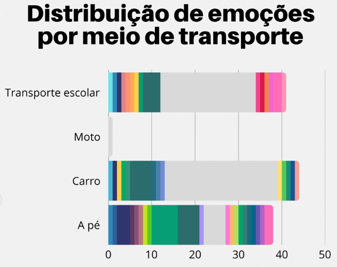 Em contraste, os modos motorizados apresentam menor conteúdo afetivo ou expressões neutras, padrão também confirmado nas falas das crianças, que descrevem esses trajetos como momentos de pouca interação com o ambiente. O gráfico abaixo apresenta as diferenças sistemáticas na forma como as crianças percebem as qualidades urbanas de acordo com o modo de transporte.