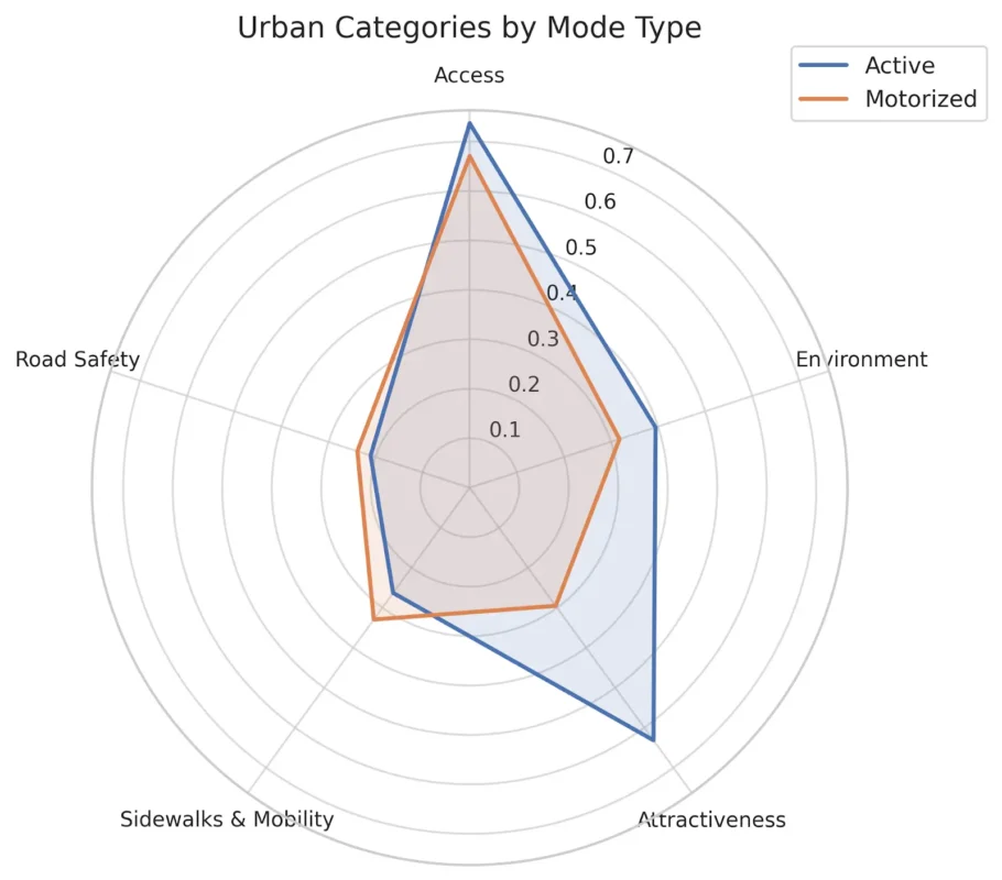 Os deslocamentos ativos registram pontuações mais altas em “acesso”, “atratividade” e “ambiente”. Já os modos motorizados apresentam valores mais altos nas categorias “calçada e mobilidade” e “segurança viária”. Nas sessões de escuta, a preocupação com segurança viária foi reforçada, frequentemente representada por falas que traziam semáforos e faixas de pedestres que precisam de manutenção e o perigo dos carros em alta velocidade.