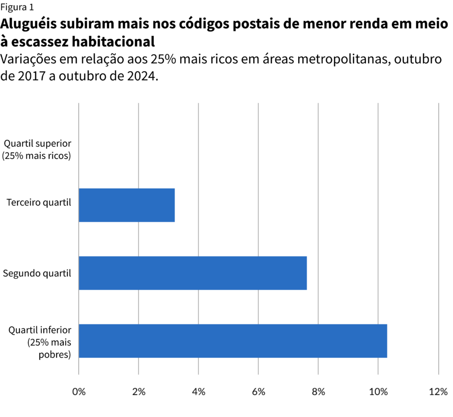 Os EUA enfrentam um déficit de 4 a 7 milhões de moradias, uma realidade impulsionada especialmente por regras de zoneamento restritivas. Dados da Zillow, uma fonte abrangente de informações locais sobre habitação e aluguel, indicam que os aluguéis aumentaram 49% nas áreas metropolitanas dos EUA entre outubro de 2017 e outubro de 2024. Para observar como os preços mudaram em áreas com diferentes níveis de renda, os pesquisadores do Pew analisaram a variação em cada código postal monitorado pela Zillow e cruzaram esses dados com a renda mediana desses códigos segundo o Censo dos EUA. Em seguida, eles compararam a variação do aluguel nos códigos postais por quartil de renda, controlando as características socioeconômicas de cada localidade e região metropolitana. O quartil inferior (os 25% mais pobres) possuía rendas anuais medianas abaixo de US$43.302 em 2017, enquanto o quartil superior (os 25% mais ricos) estava acima de US$69.804. O quartil de renda mais baixa enfrentou um aumento médio de aluguel 10 pontos percentuais superior ao do quartil de renda mais alta.