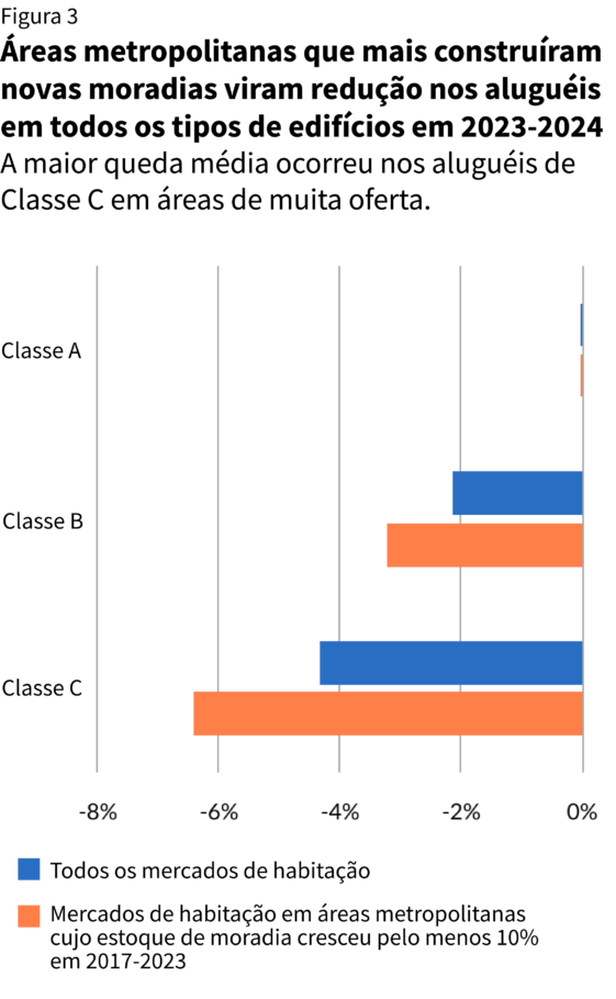 Esse padrão se repetiu de forma ampla. Ao analisar mais de 41.000 grandes edifícios em 223 áreas metropolitanas, houve uma tendência clara: os aluguéis da Classe C diminuíram mais em relação aos da Classe A. Em mercados de muita oferta, o crescimento do aluguel foi mais lento e, crucialmente, desacelerou mais para as unidades de Classe C, demonstrando que a oferta adicional foi especialmente benéfica para quem vive em apartamentos de menor custo.
