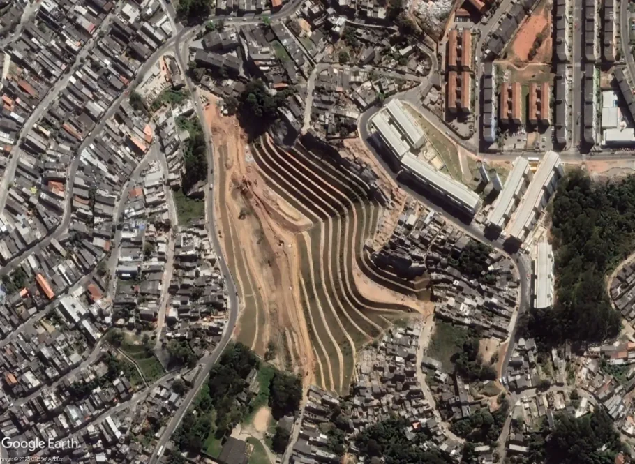 Nas favelas, infraestruturas tradicionais e SBNs “de catálogo” correm o risco de competir diretamente com espaços para moradia. O caso do Morro dos Macacos, em São Paulo, é emblemático. Em 2011, após um deslizamento de terra devastador na comunidade, a prefeitura removeu as famílias da área de risco e executou obras de estabilização e contenção de encostas no morro. Poucos anos depois, a área voltou a ser ocupada, desta vez incorporando a própria estrutura pública executada pela prefeitura como suporte, evidenciando que, onde a moradia é urgente, o território pode absorver qualquer superfície disponível.