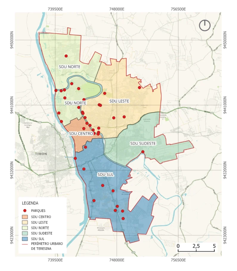 Distribuição dos Parques de Teresina (PI) por Zona. Mapa elaborado pelos autores a partir de dados da Prefeitura Municipal de Teresina (2015).