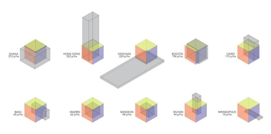 Angel decompõe a densidade em fatores mensuráveis e prova que existem “diversos tipos de densidade”. Uma cidade pode ser densa pela altura (como Hong Kong), mas também pela alta cobertura do solo (como Bogotá) ou, infelizmente, pela superlotação (como Kinshasa).