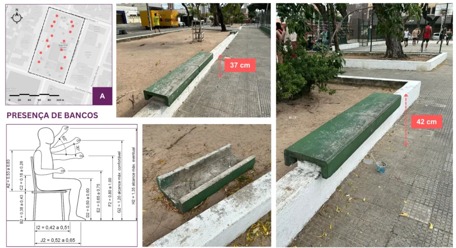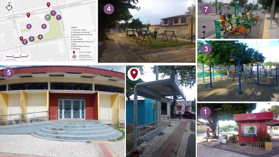Em Fortaleza, a pesquisa “Longevidade, Acessibilidade Urbana e Conforto Ambiental” investigou como três praças aparentemente distintas influenciam a saúde mental de pessoas idosas. A pesquisa combinou medições técnicas (quantitativas), como acessibilidade, iluminação, ruído, qualidade do ar e conforto térmico, junto a entrevistas (qualitativas). O resultado, que contou com a participação de 236 pessoas idosas, revela uma relação complexa: mesmo com problemas de acessibilidade e manutenção, as praças seguem sendo espaços de afeto, espiritualidade, pertencimento e vitalidade.